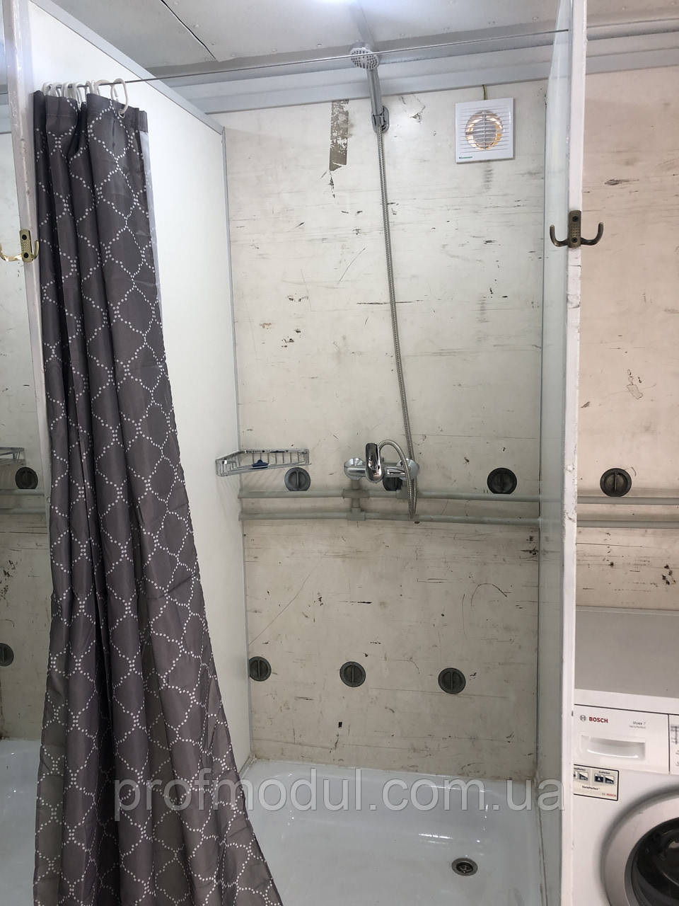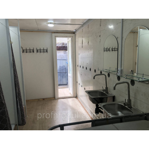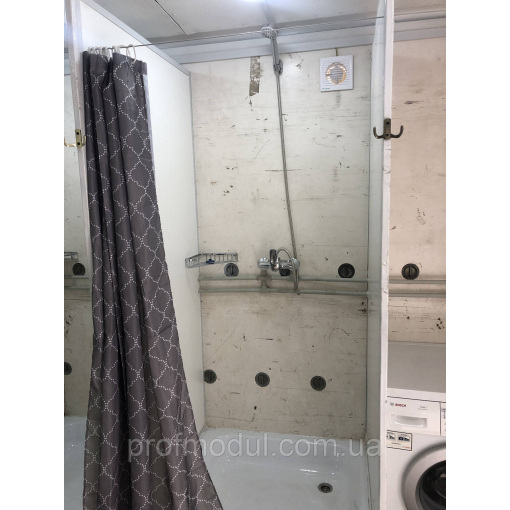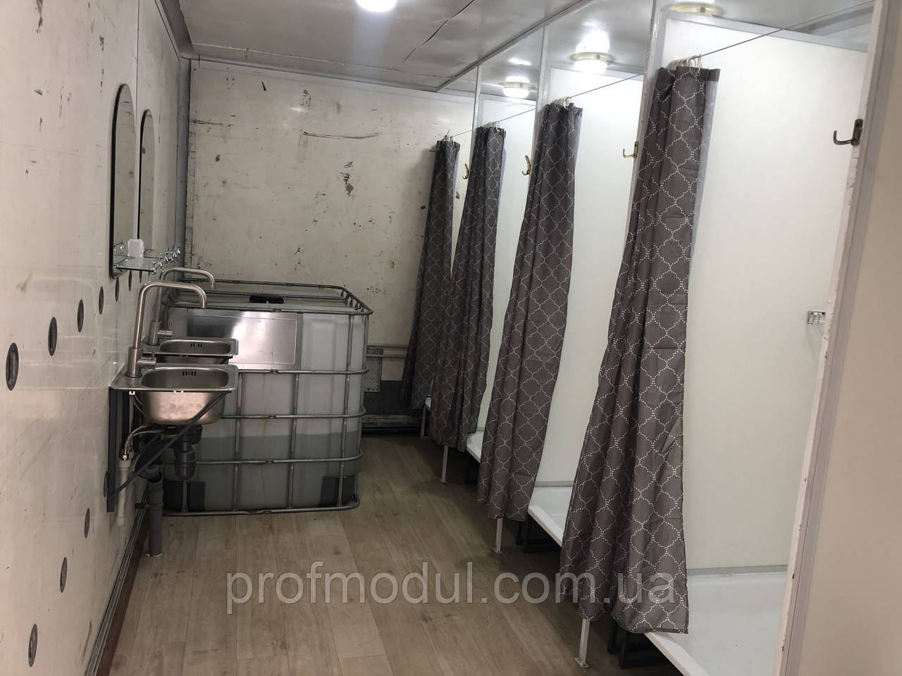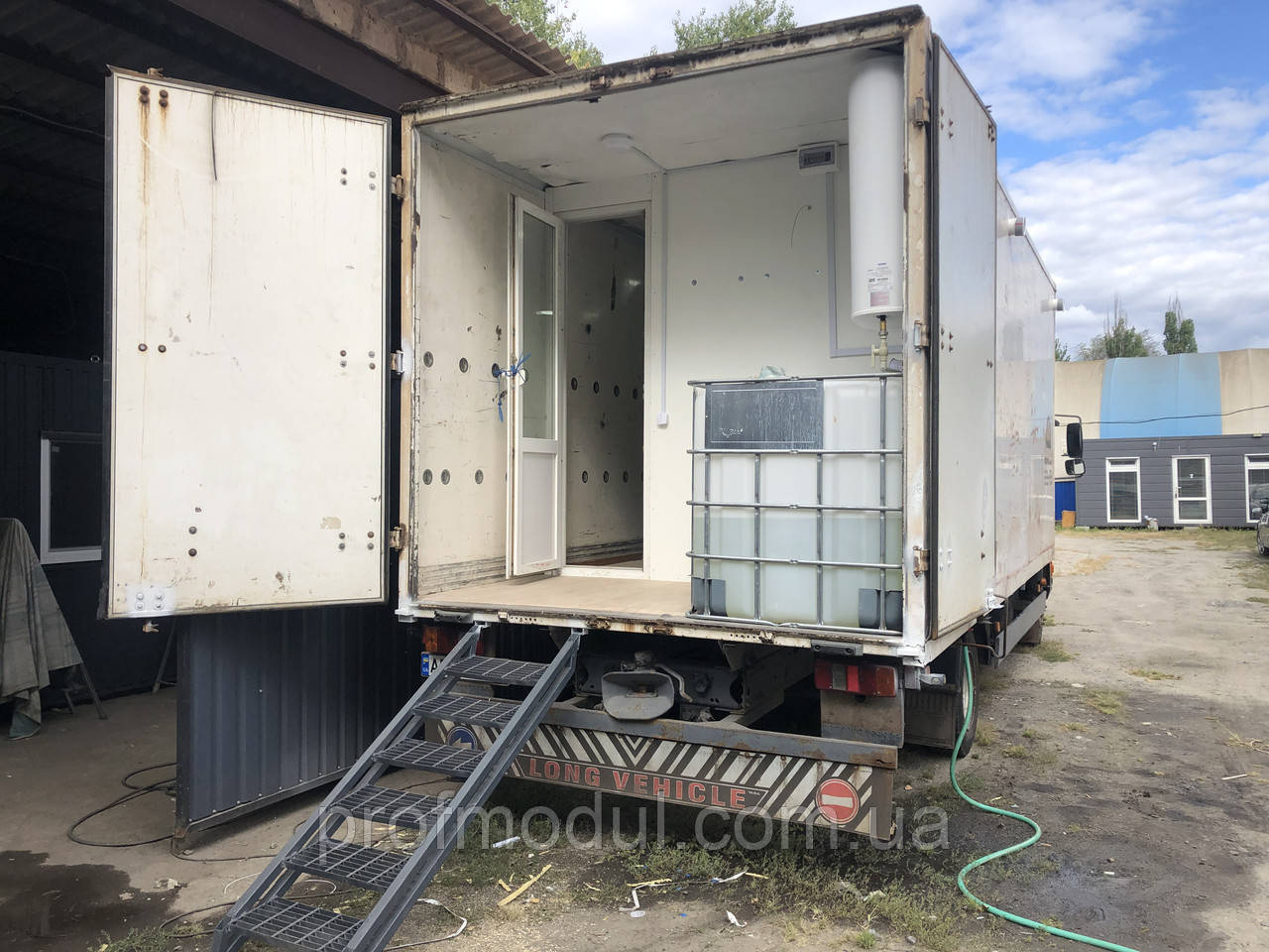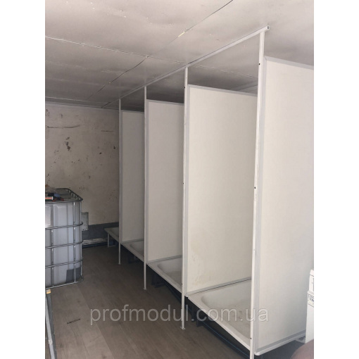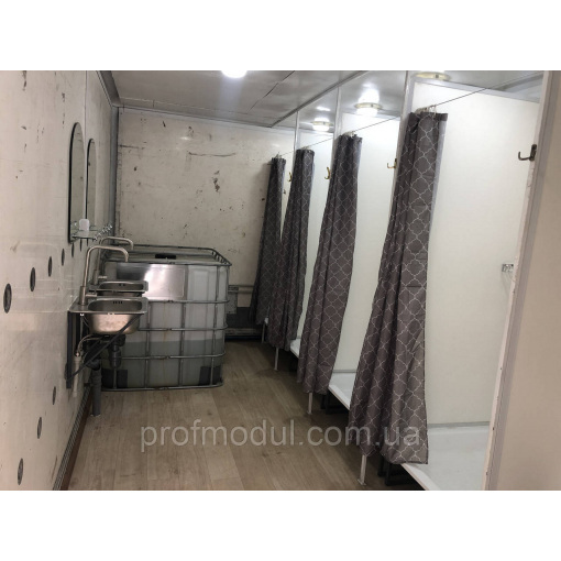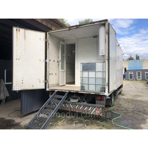Мобільна душова або автодуш створена по власному проекту замовника і призначена для використання в польових умовах. Повністю автономна душова має розміри 6*2,4*2,3 м, має дизельний генератор для постійної напруги 220В, та насосну станцію для тиску у водопровідній системі. Встановлені: два єврокуба по 1000л кожний,які з'єднані між собою, два бойлера на 80 і 100л, чотири душові кабінки зі змішувачами і лійками, два умивальники зі змішувачами та дзеркалами. В кожній кабінці окреме світло.
