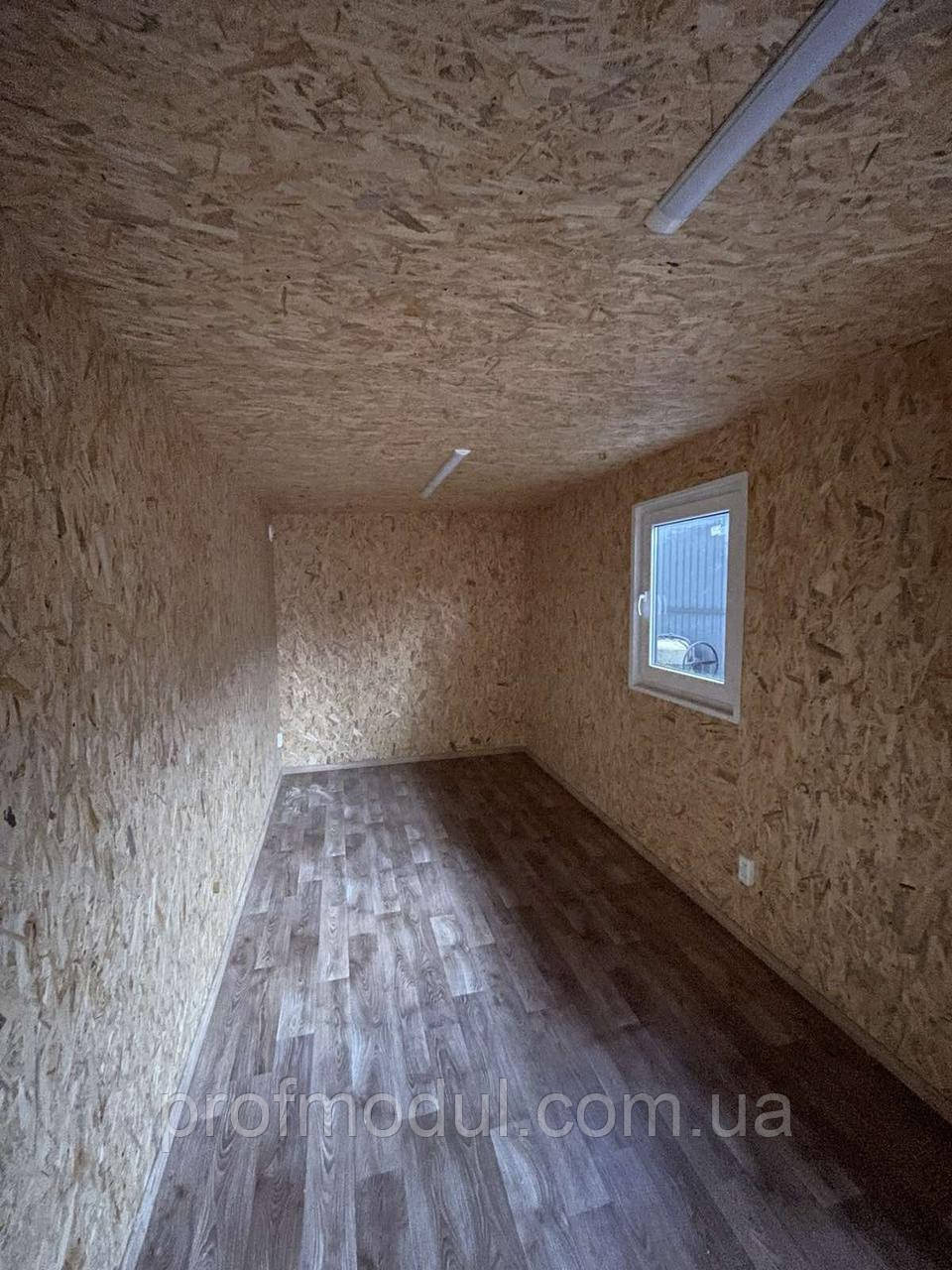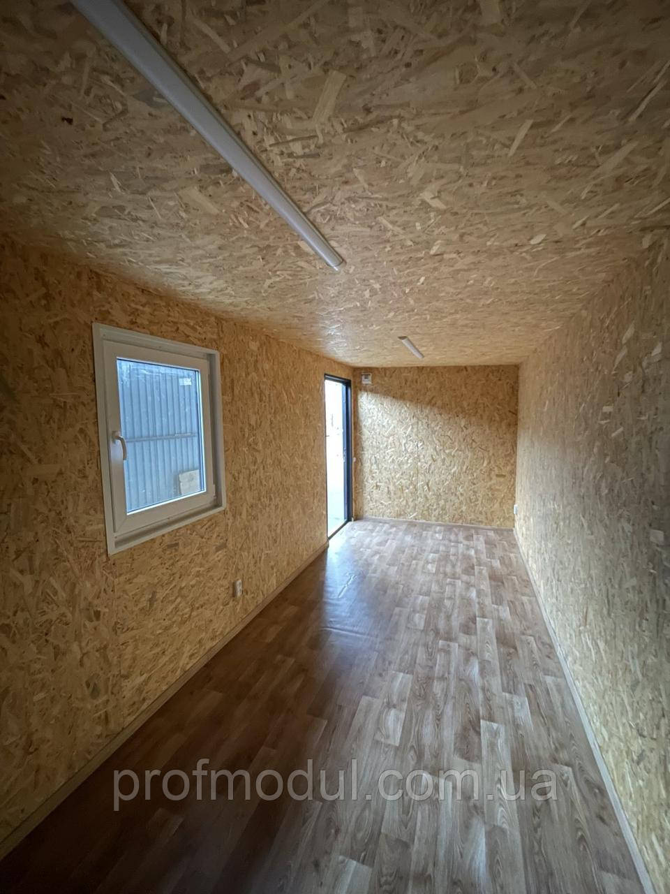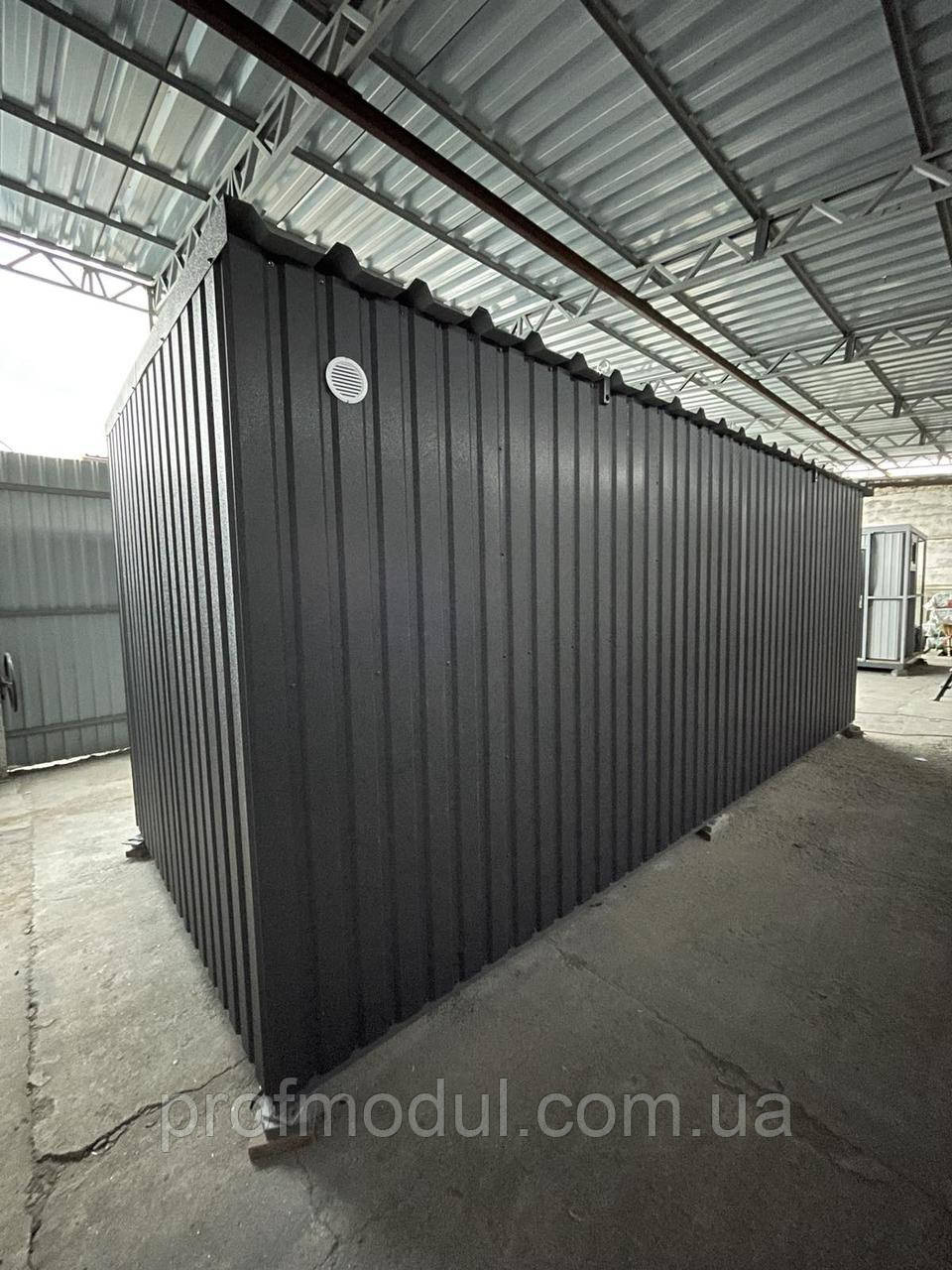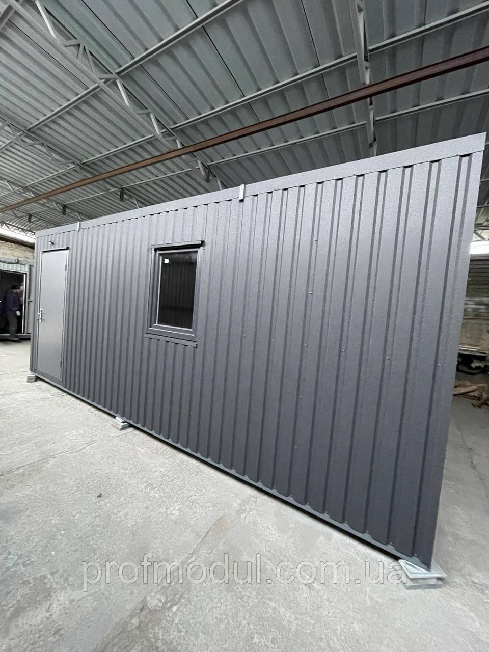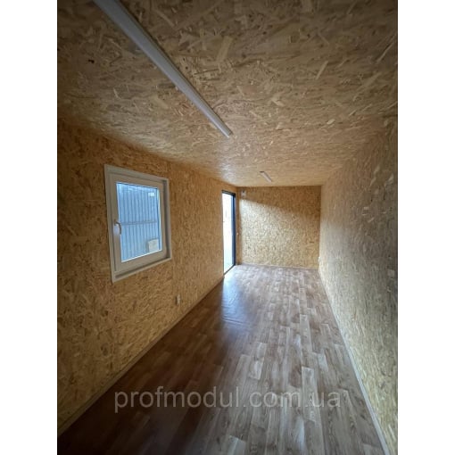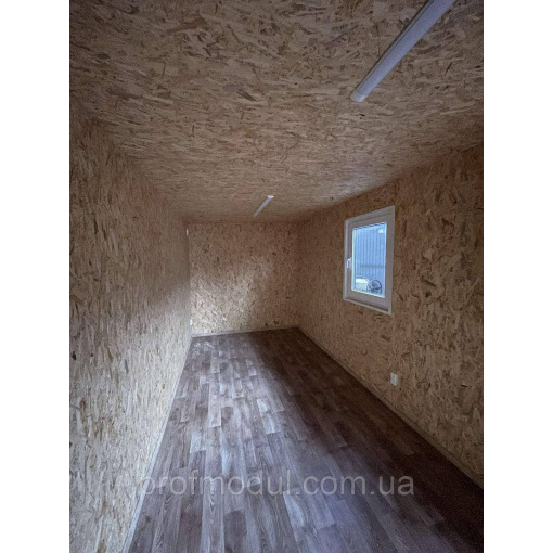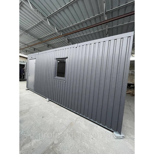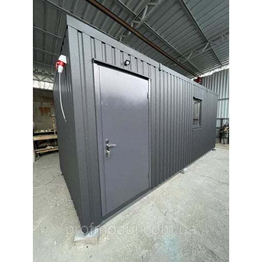 - Несучий каркас из швелера 100*50 мм. В середине наружных стен вертикальные стойки из швелера 100*50 мм с шагом 1200 мм. Между ними поперечные стойки из швелера 100*50 мм по всему периметру каркаса, на высоте 1200 мм от низа пола. В середине периметра потолка -лаги с шагом 1200 мм. В середине периметра пола - лаги с шагом 600 мм. Пол усилен дополнительными лагами. Лицевые элементы каркаса окрашены. - Пол – дно подшито оцинкованным листом 0,5мм, утеплитель 100 мм базальтовая вата, гидробарьер, плита OSB 22 мм, линолеум, плинтус. - Стены – оцинкований профлист ПС 20 с полимерным покрытием RAL 7024 графит толщина 0,45мм. Паро-гидроборарьер, утеплитель 100 мм базальта вата, плита OSB 10 мм. - Поклевка и потолок односкатна, оцинкований профнастил ПК44 товщина 0,45 мм;RAL 9006 серый, паро-гидробьер, утеплитель 100мм базальтовая вата, плита OSB 10 мм. - Входная дверь – металлические 950*2000 мм (металл 1.5 мм., производство Украина, утепленная, имеет врезанный замок с комплектом ключей, – 1 шт. - Окна – металлопластиковые 800*1000 мм, поворотно-откидное – 1 шт, стеклопакет однокамерный. - Электропроводка: внешний штепсель подключения (220V), розетки кабель 3*2,5 мм, освещение кабель 2*1,5мм, внутренний щит с автоматами, розетки двойные - 2 шт, выключатель одноклавишный – 1 шт, LED светильники 36 Вт – 2 шт, проводка скрытая внутри стен,проложенная в металлической гофре.