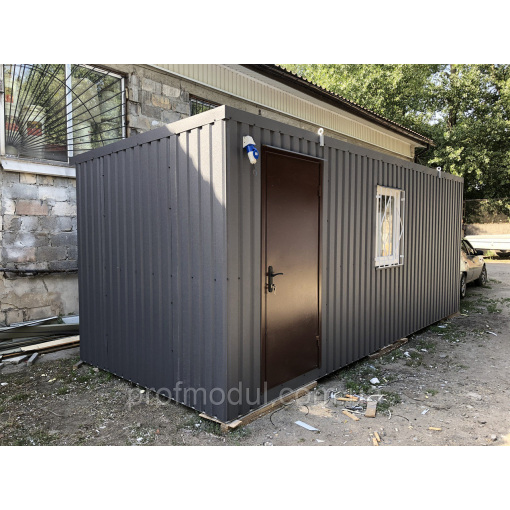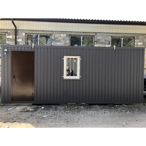 Красивая бытовка-офис в цвете RAL 7024 (мат) Выполнена на основе сварного каркаса из швеллера 100*50*2 мм, покрытого грунтовкой.Утеплена 100 мм пенополистирола и обшита внутри плитами OSB 10 мм. Установлены 2 металлопластиковых поворотно-откидных окна 800*1000 мм и дополнительно защищены решётками. Входная дверь - металлическая (1,5 мм) утеплённая, с МДФ вставкой внутри. Межкомнатная дверь - 800*2000 мм , МДФ с ламинацией и замком. Дополнительно установлен кондиционер. Так же выполнена вся электроразводка (автомат, розетки,включатели)