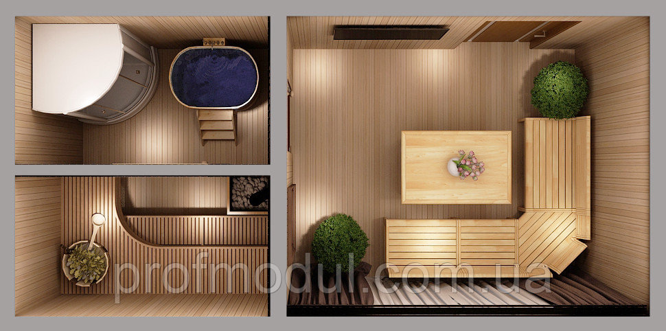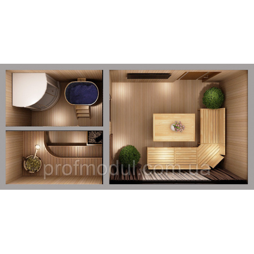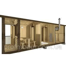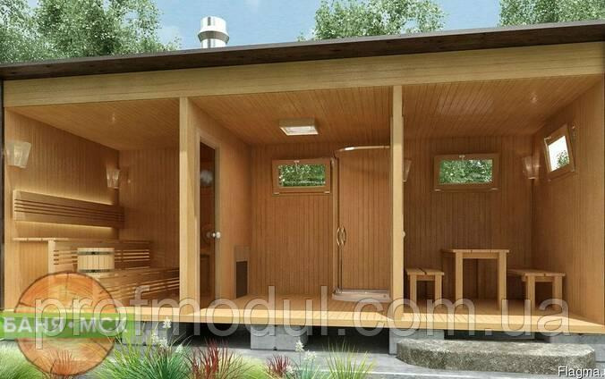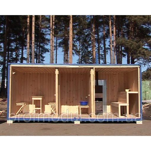 Модульная баня стандартных размеров — 6*2,5*2,5м. Однако, по желанию заказчика можно изготовить и других размеров а так же совместить два модуля в одну полноценную баню на 30 м.кв.