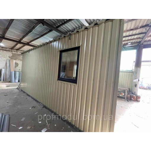- Стіни – оцинкований профлист ПС 20 з полімерним покриттям RAL (7024) товщина 0,45мм . Паро-гідробар’єр ,утеплювач 150 мм базальтова вата, плита ЛДСП 16 мм, колір сірий.