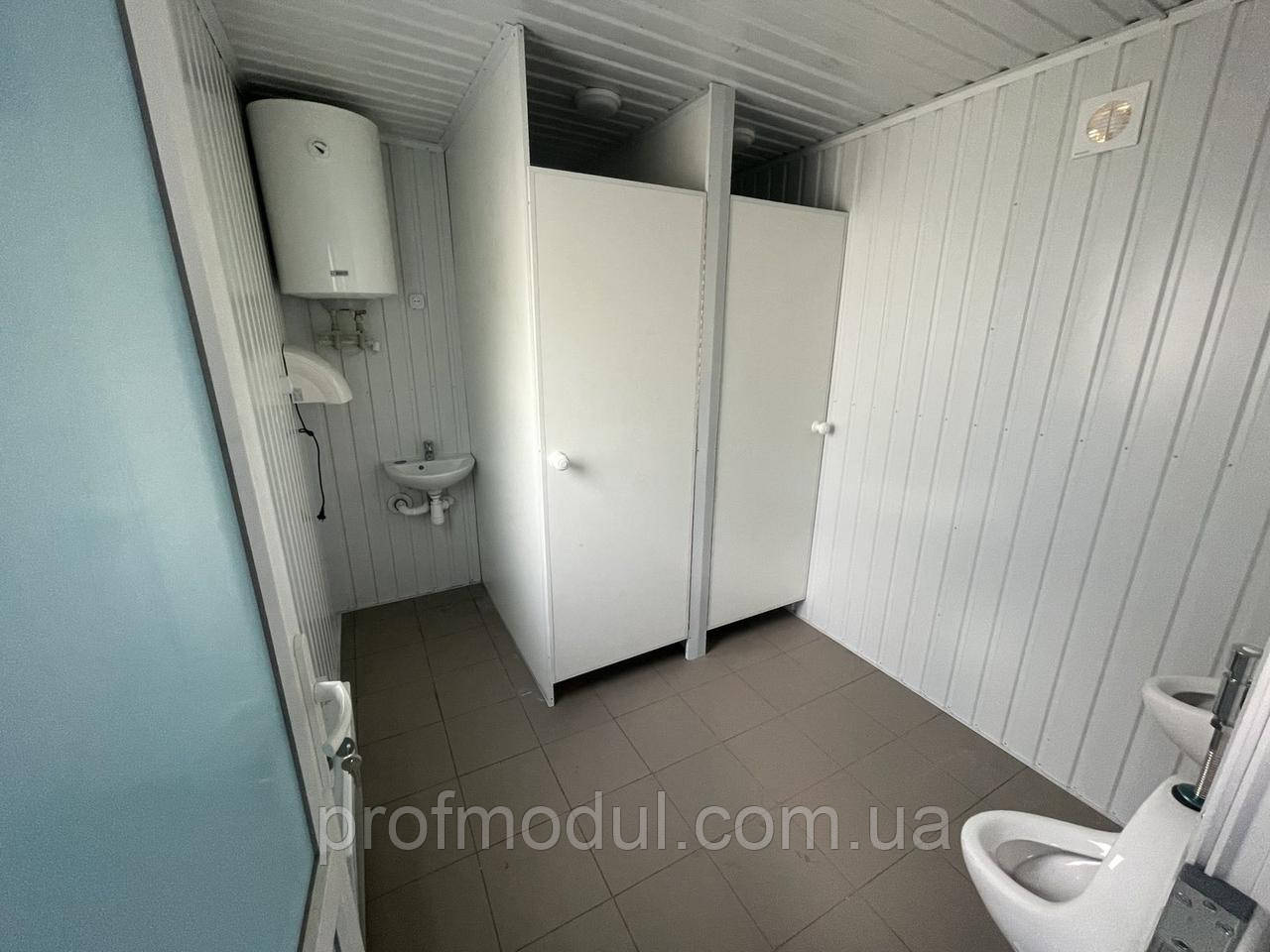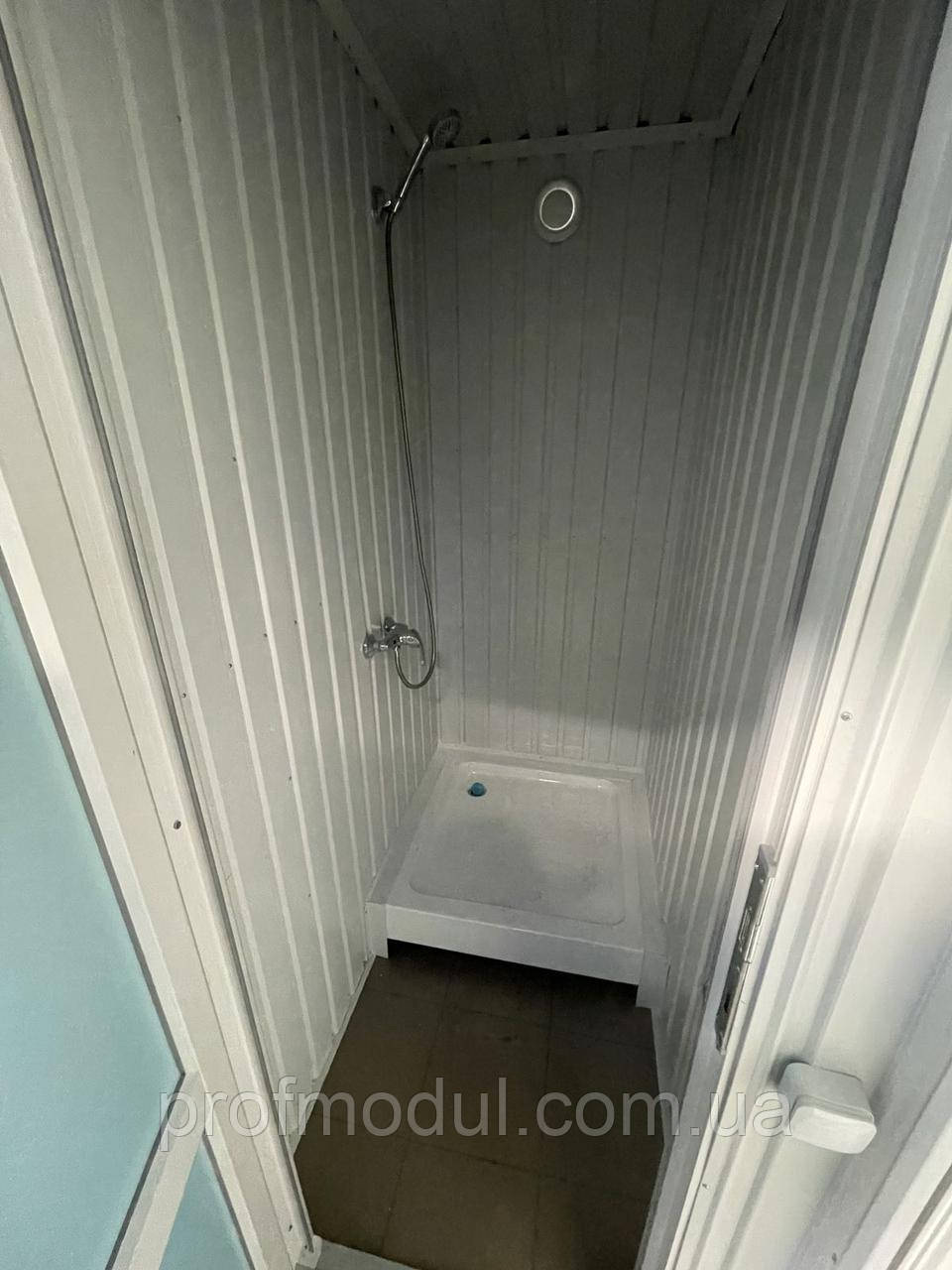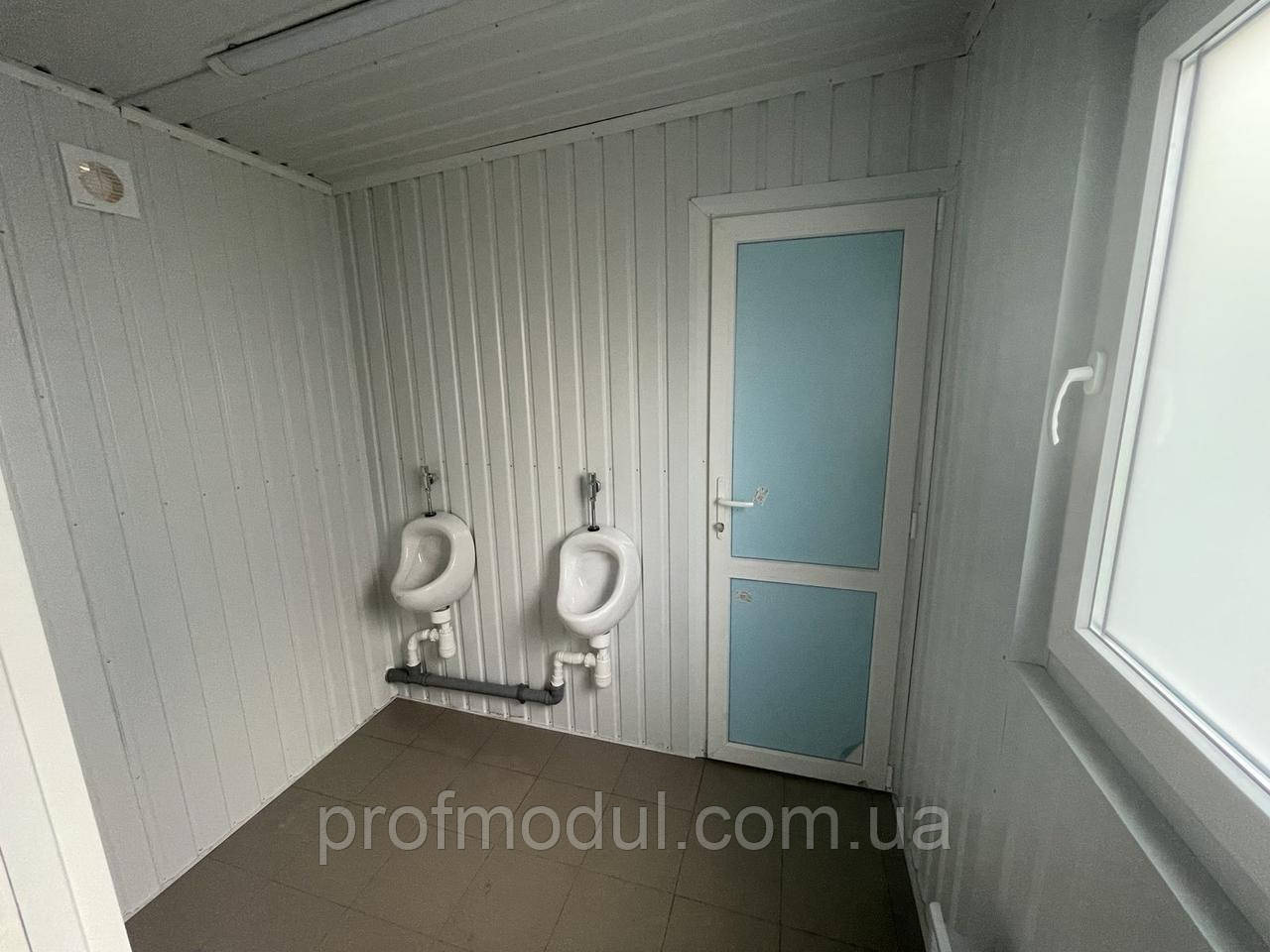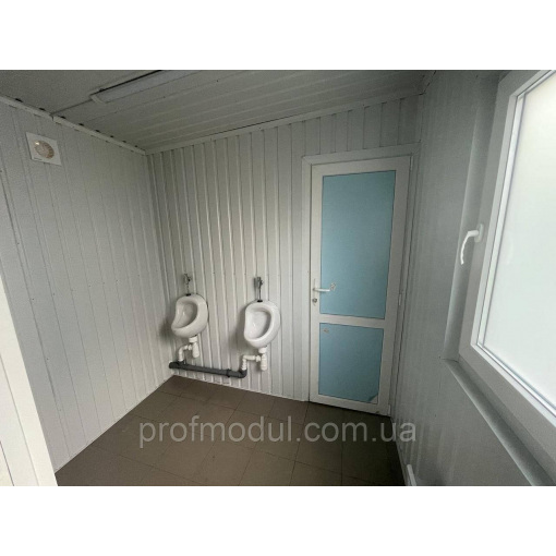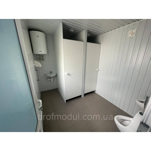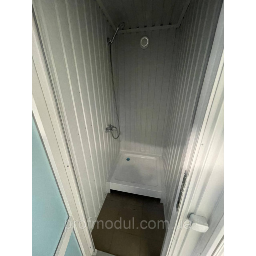 Побутівка має розмір 6*2,5м і виготовлена за кресленням замовника. Всього лиш на 14 м/кв нам вдалося розмістити і кухню 2*2 метри і душову і санвузол з двома кабінками, двома пісуарами, умивальником та бойлером.
