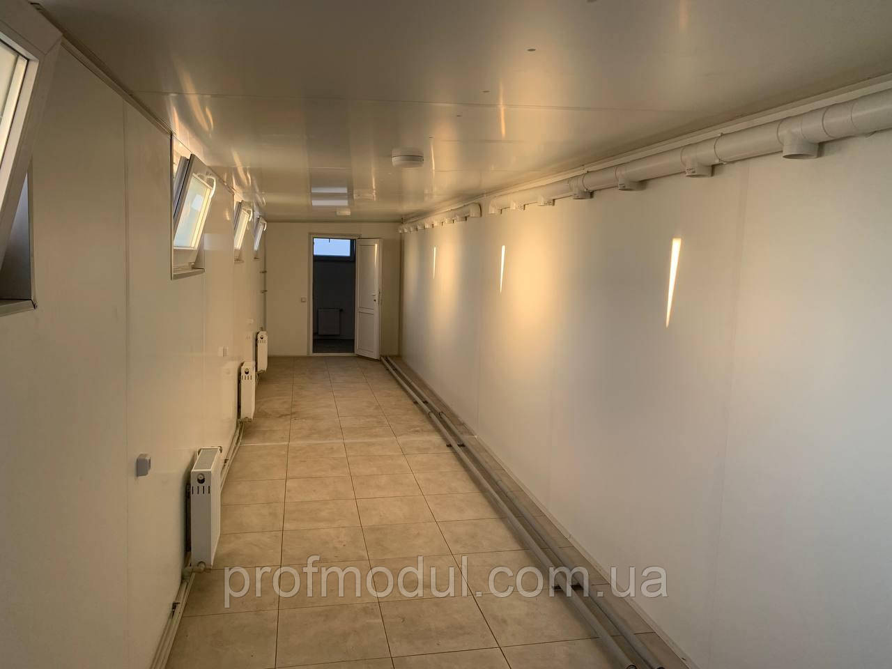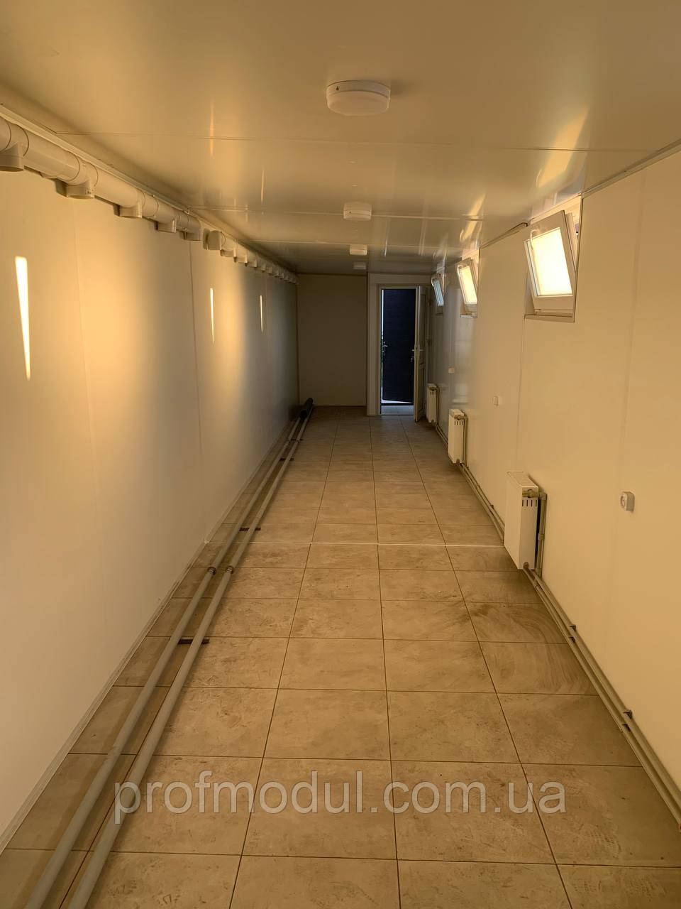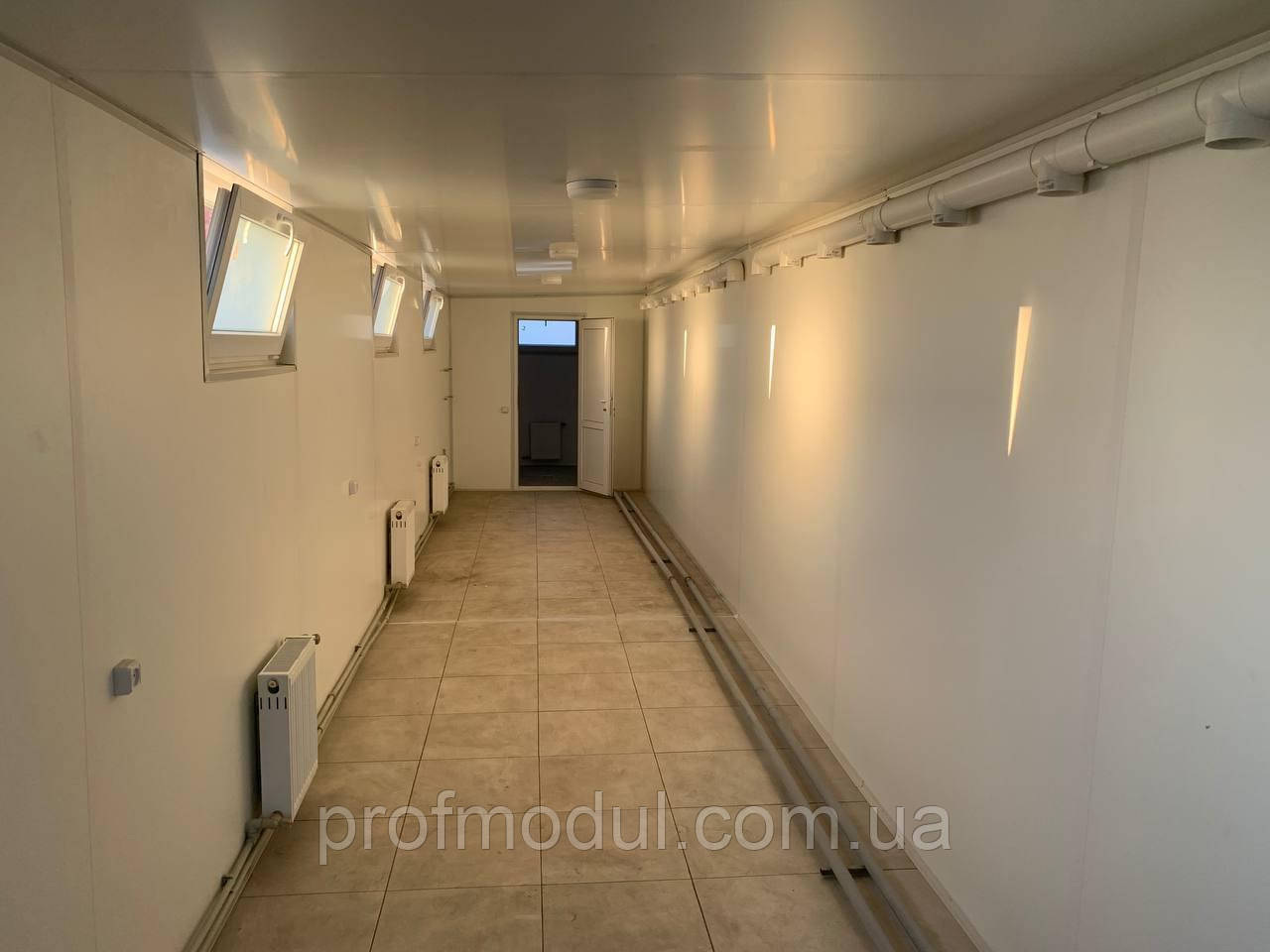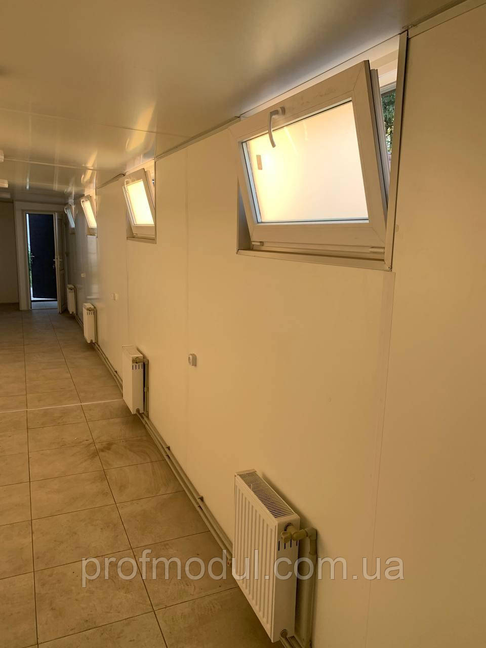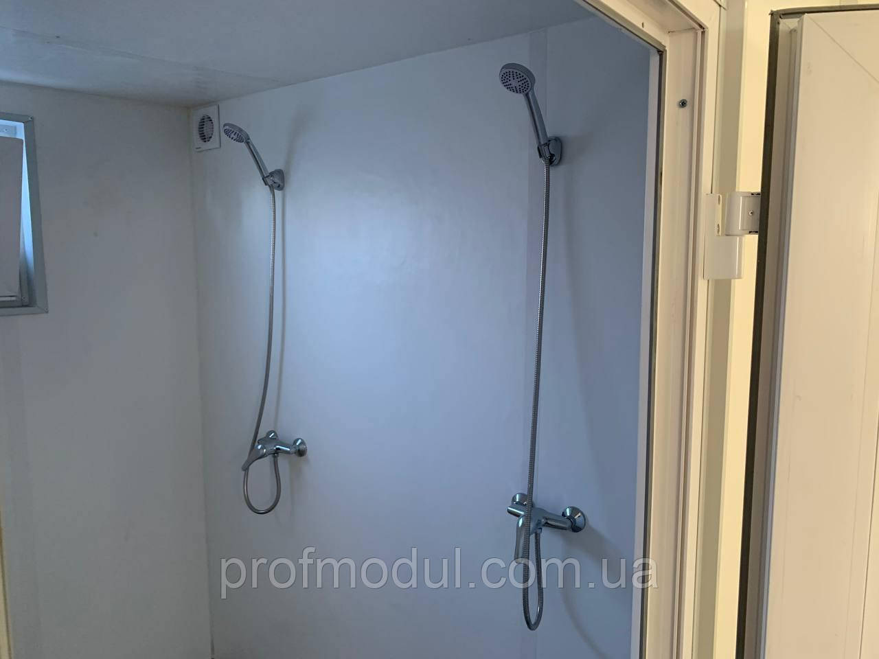 - Стіни – оцинкований профлист ПС 20 з полімерним покриттям RAL (на вибір) товщина 0,45мм . Паро-гідробар’єр ,утеплювач 100 мм базальтова вата, плита ЛДСП 16 мм, білого кольору. Стіни в душовій – ПВХ вагонка 250мм безшовна,біла.
